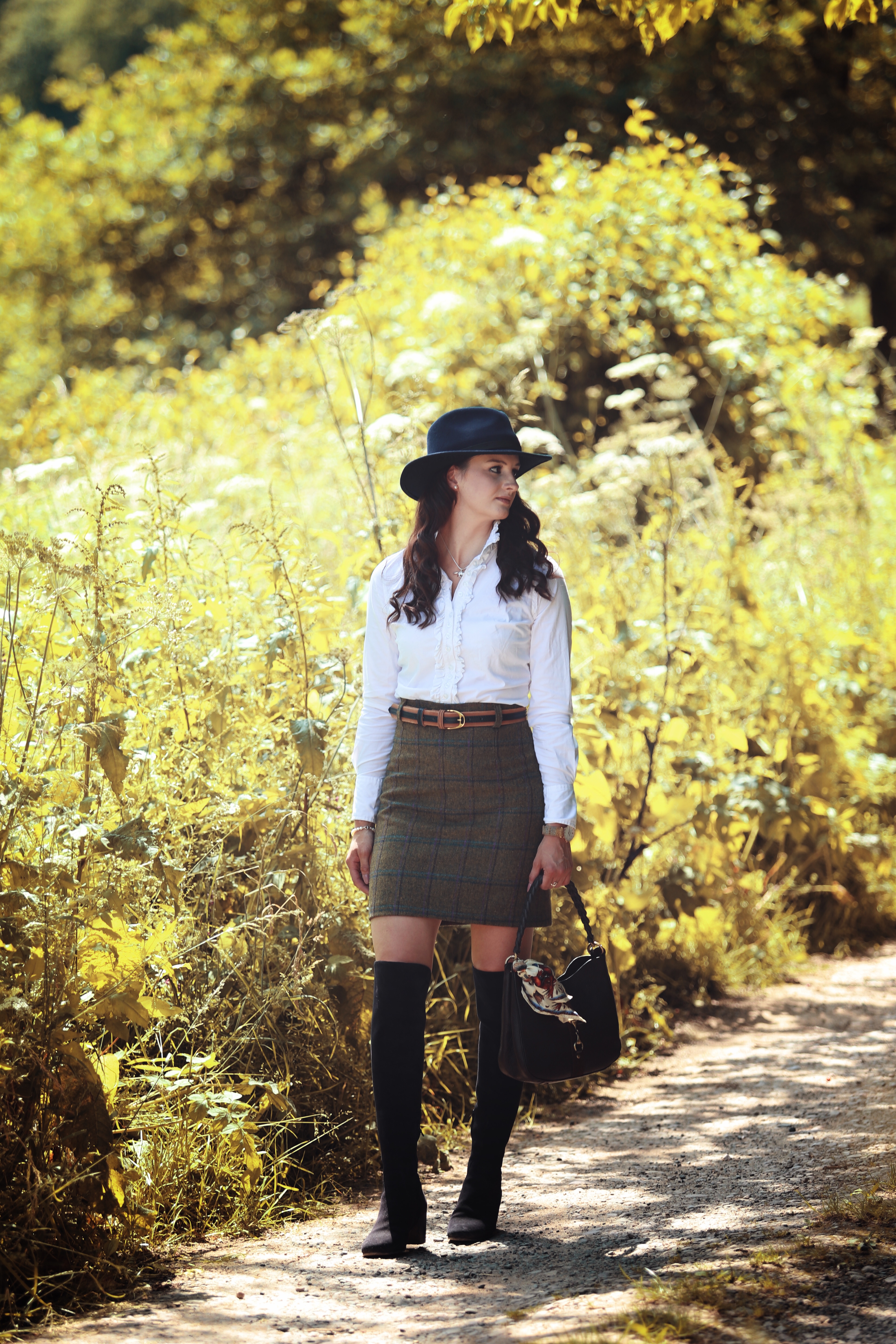 My classic white shirt option for the outfit has a simple ruffle and comes from Dubarry. A white shirt is a staple item and a key addition for any country wardrobe. They pair perfectly with a tweed skirt for effortless, elegant style.