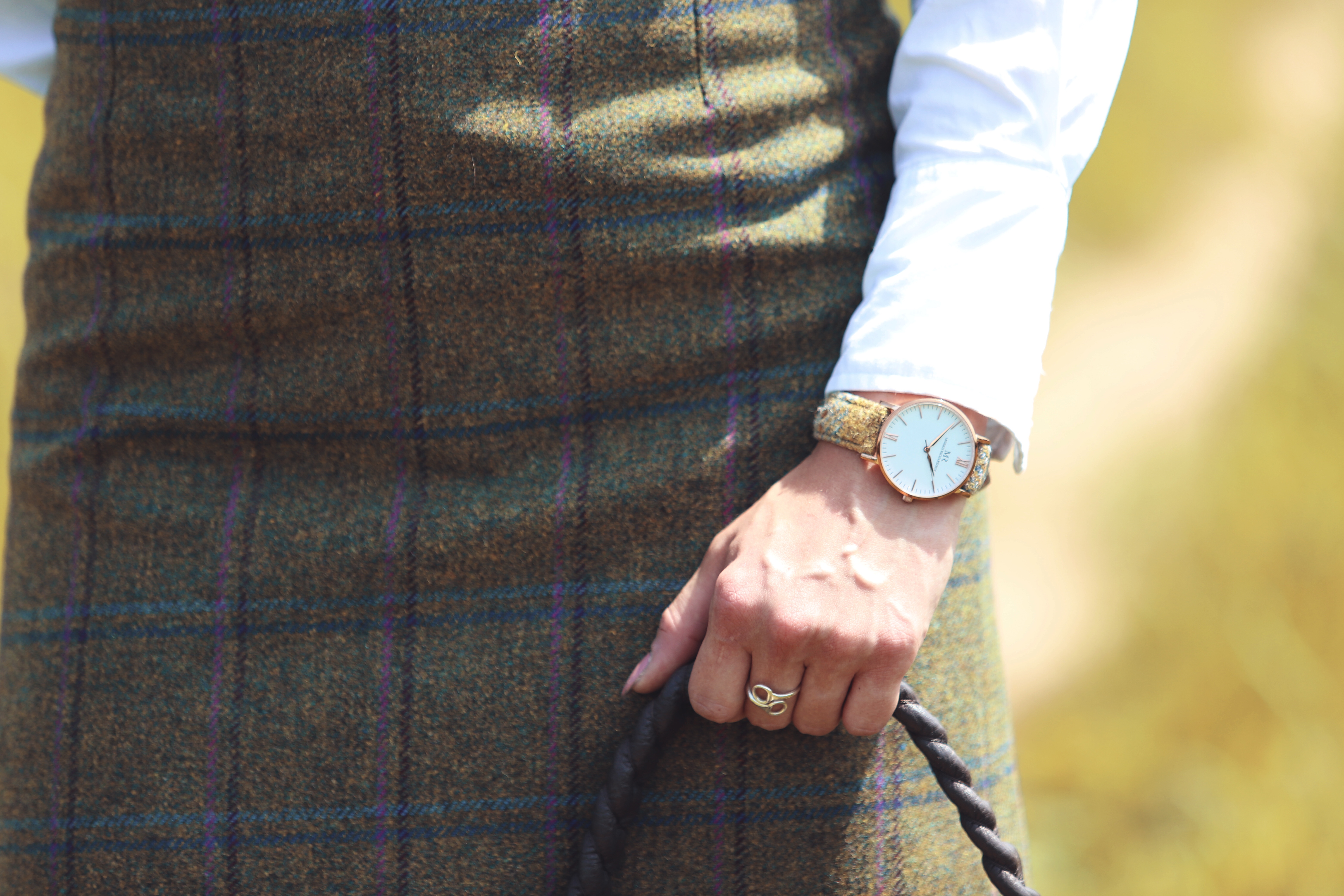 My lovely tweed watch is by Morris Richardson and it compliments any outfit due to its interchangeable watch straps. The tweed from the skirt and the watch compliment each other perfectly.