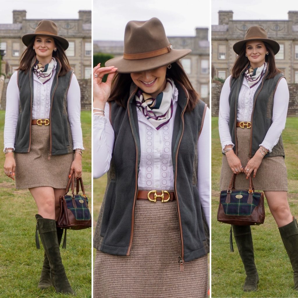 It wouldn’t be The Game Fair, without some tweed, so I used a subtle brown skirt to pull this in, contrasted by the vibrant green and navy tweed of my bag. I pulled through deep green tones in my boots and bag, and rich chocolate brown through my fedora. I finished off with a white shirt, and silk scarf, to really complete the look.