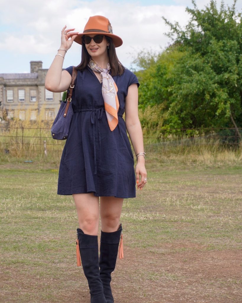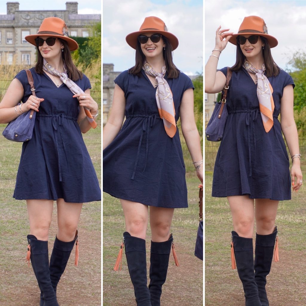 To compliment the deep navy colour of the dress, I have brightened the whole look, by incorporating this orange/coral colour. Lightening up a darker base colour really helps to elevate the look for Summer, and this shade of orange is surprisingly easy to style, but incredibly summery, adding that sense of season to the look. I have used my hat, scarf and tassels to evenly distribute the colour through my outfit, keeping the rule of thirds and allowing for a balanced look.